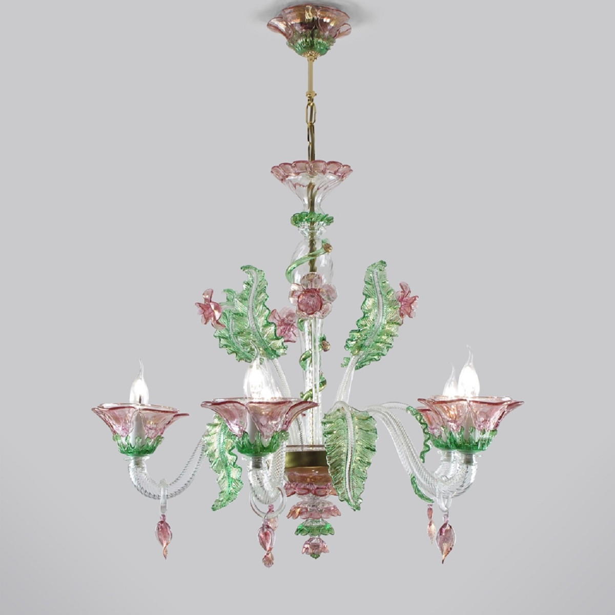 This chandelier stands out for its particularly rich and complex execution. The cups have applications with a drop effect on the lower part, and petals applied individually on the upper part. The leaves are jagged, while the central body of the chandelier is enriched by a twisted decoration. The green and pink are covered with gold leaf, which gives shine to the whole chandelier. Available in custom dimensions, number of lights, and combinations of colors upon request.